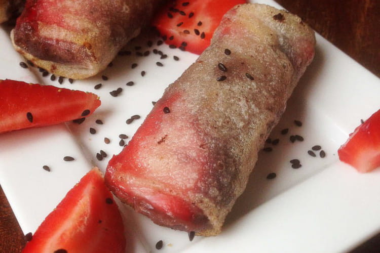 Ingrédients : 250g de fraises, 30g de sucre, beurre, 8 cuillères à café de crème pâtissière, 8 feuilles de brick,
